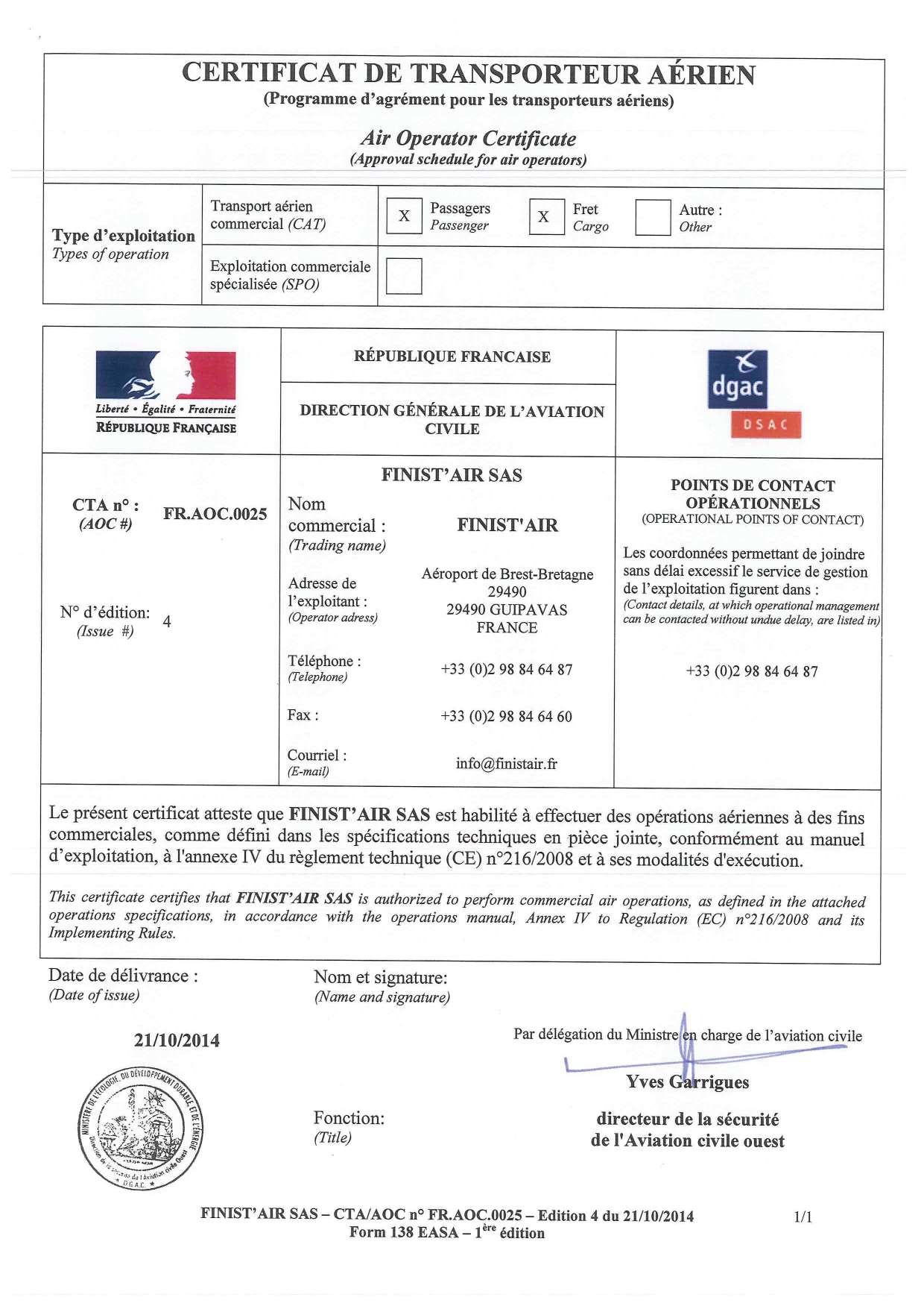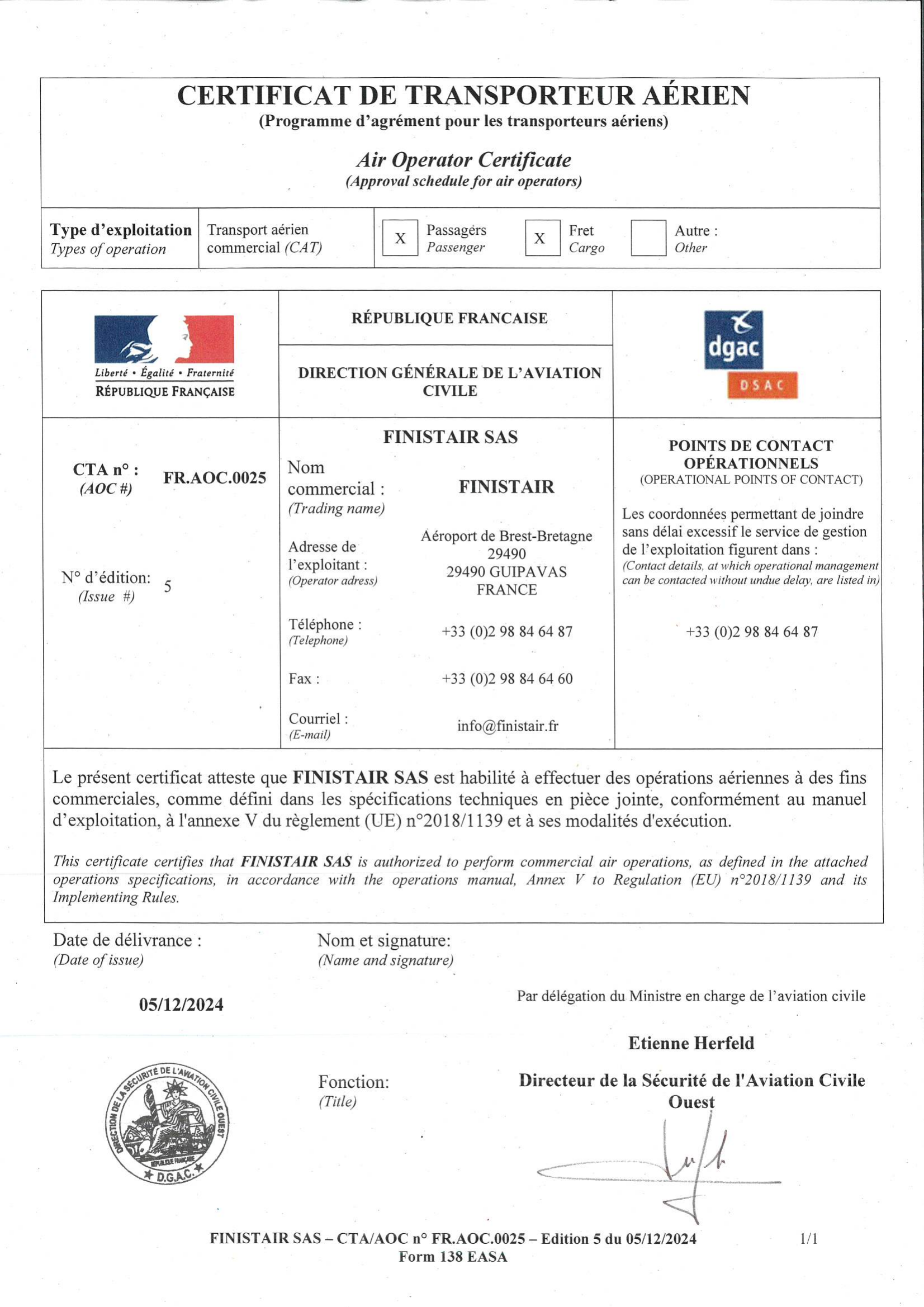 Consultez notre certificat de transport de passagers et marchandises délivré par la Direction générale de l'aviation civile (DGAC).